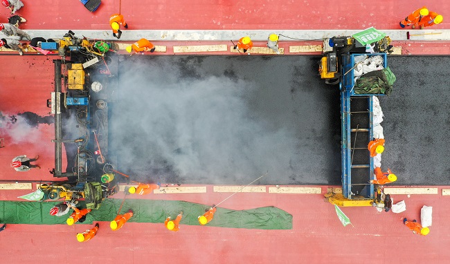 10月30日,中交二航局投资建设的世界最大跨度公轨两用钢桁梁斜拉桥——重庆白居寺长江大桥主桥浇筑式沥青完成首次铺装,自此,大桥桥面沥青铺装全面展开。