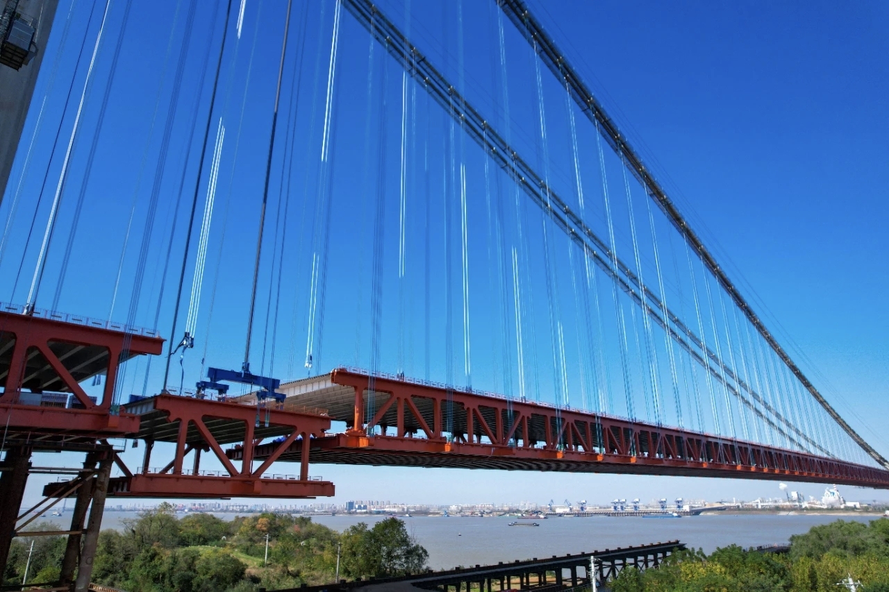 因上受花湖机场航空限高影响,下要满足长江通航需要,燕矶长江大桥主塔高度仅184米,垂跨比也达到了千米级悬索桥中前所未有的1:15。为解决这一结构难题,建设团队采用世界首创不同垂度四主缆双层悬索桥结构体系,其同侧主缆高度、长度、垂度均不同,以此分散荷载,并提高桥梁的稳定性,且优化了索鞍及主缆规模,使主缆受力更合理,让这一超级工程得以“现世”。