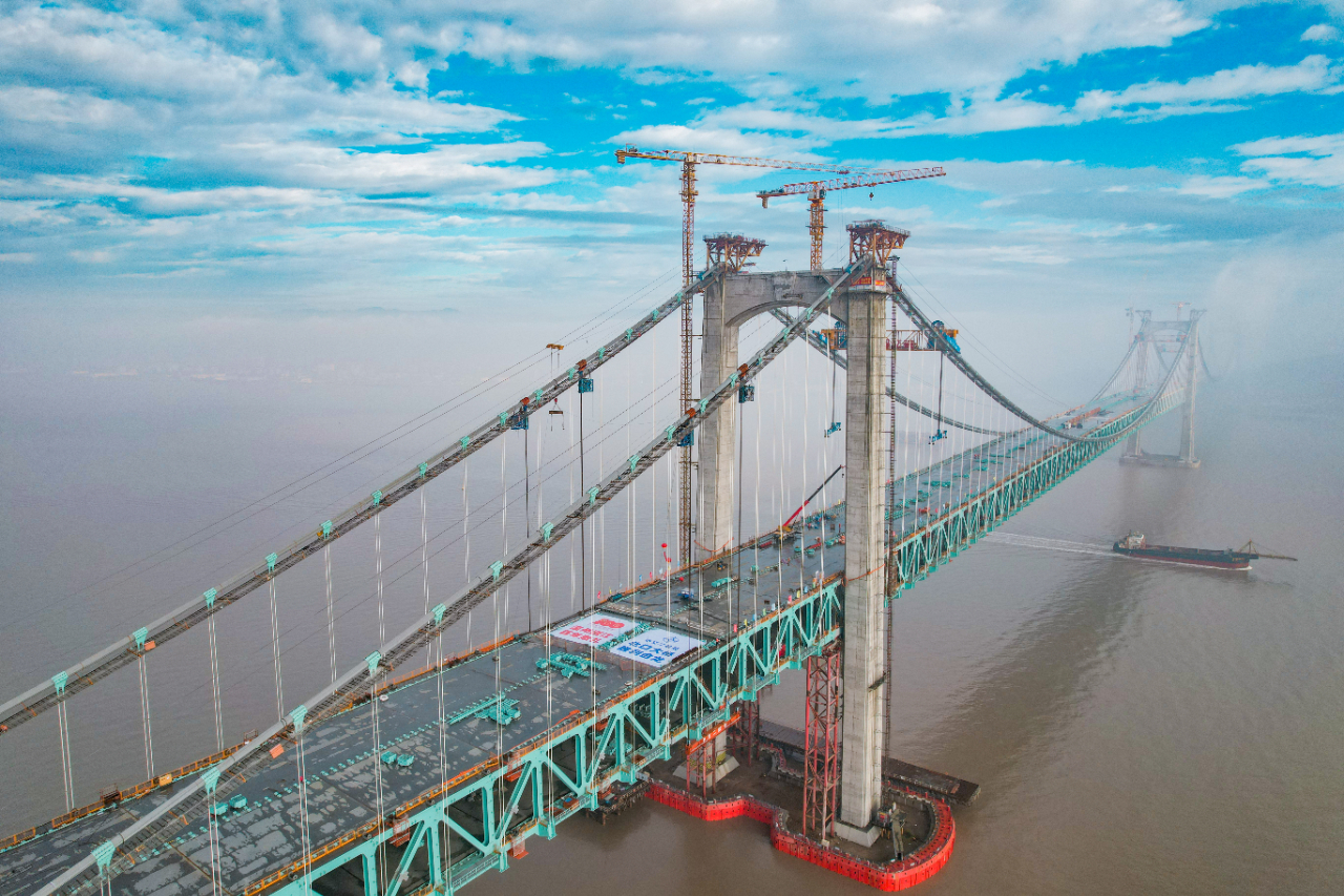 针对“缆梁相交区”吊装难题,项目部成功实施“缆载吊机+分体式提升设备”接力吊装创新方案,4台缆载吊机南北跨同时作业,大幅节约设备拼装时间、减少高空作业人员。项目团队积极探索智能建造技术,成功应用大跨悬索桥缆索智能施工系统,研发出国内首台智能化深槽入鞍机器人,通过液压顶杆将索股“推”进索鞍,成功克服传统工艺将索股“砸”入索鞍产生的跳丝、乱丝问题,相比传统人工入鞍工效提升30%。