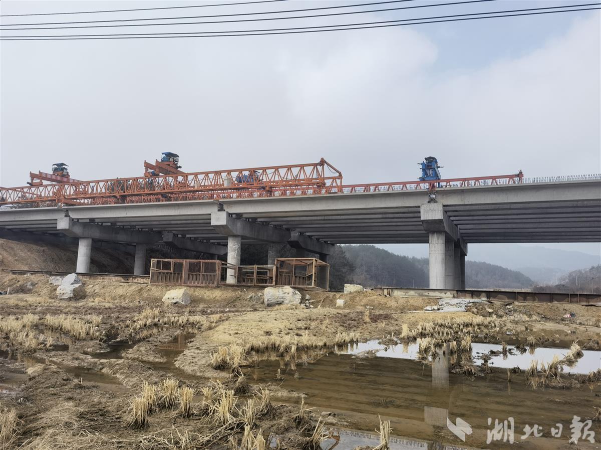 2月10日,在大悟县河口镇与武汉黄陂区交界处,湖北日报全媒记者在中交二航局的标段看到,宽34米、双向六车道的武大高速“骨架”显现,如一条“巨龙”蜿蜒北去,这里是平原到山区的分水岭。在巨大的架桥机助力下,逢山开路、遇水搭桥的高架桥箱梁已基本架设完毕。