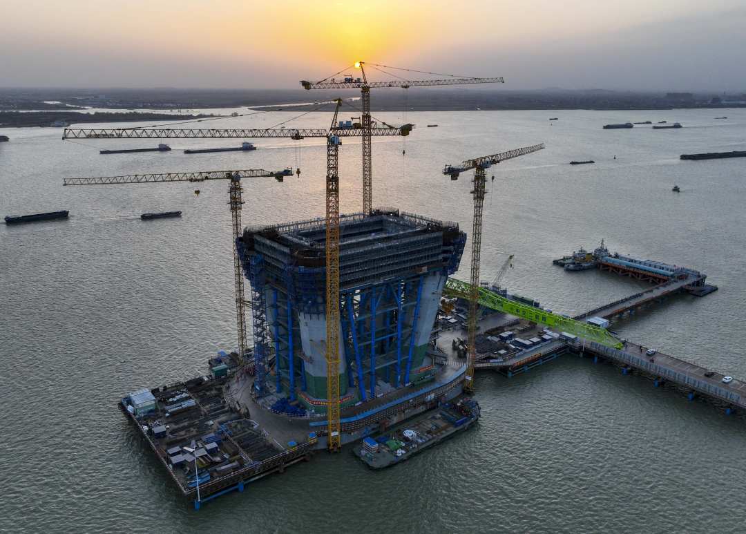 3月5日,工人对常泰长江大桥5号墩主塔进行下横梁钢筋绑扎作业。近日,由中交二航局施工的常泰长江大桥项目全面进入“大干热潮”,1200多名建设者24小时不间断奋战在施工一线。据了解,5号墩主塔已完成下塔柱施工,“长高了”近50米;钢桁梁、节段梁、现浇梁施工并驾齐驱,全线桥墩接连拔地而起,逐步形成工程建设多点开花、水陆全面推进的新局面。