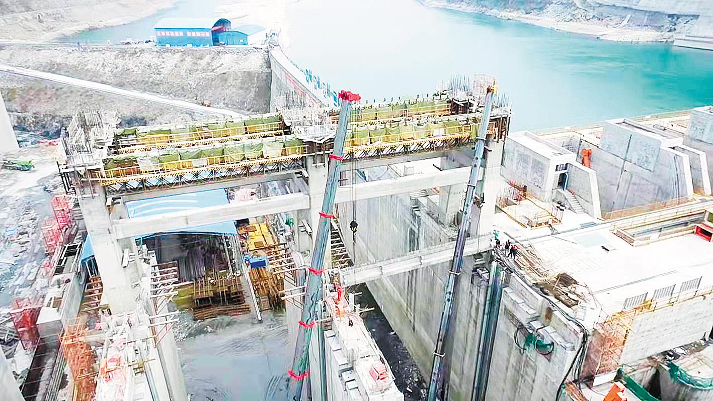 为此,项目部研发自动温控通水冷却系统,建立制冰车间,将薄冰加入混凝土,采用砂石料预冷新工艺,保证混凝土出机温度为9摄氏度,比常温低20摄氏度左右,并且全程冷链运输,有效控制混凝土最高温度,防止混凝土温度裂缝。同时,在坝体埋入数千个感应器,利用北斗导航系统实现对浇筑阶段的实时监控、全面感知。