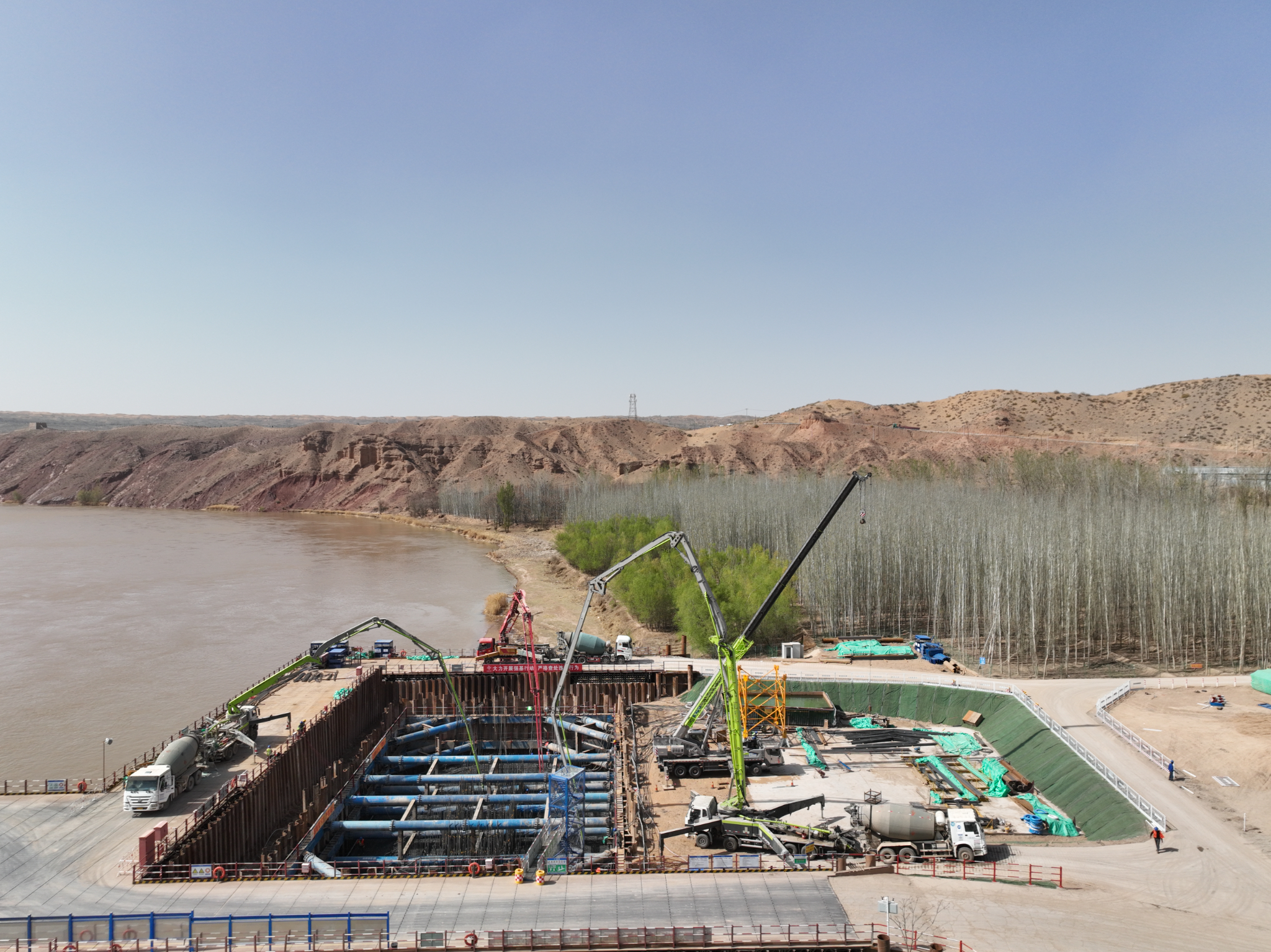 沙坡头黄河大桥为双塔双索面半漂浮体系钢混组合梁斜拉桥,是国道338线中卫至孟家湾段项目的重要控制性工程,主墩承台采用整体式八边形承台,最长处41.7米,最宽处约23米,厚5.5米,采用分两层浇筑施工。本次混凝土浇筑高度3.5米,浇筑混凝土体积为2954立方米。经过36小时的连续施工作业,承台第二层混凝土顺利浇筑完成,标志着沙坡头黄河大桥主桥施工转入主塔施工新阶段,为项目顺利建成奠定了良好的基础。
