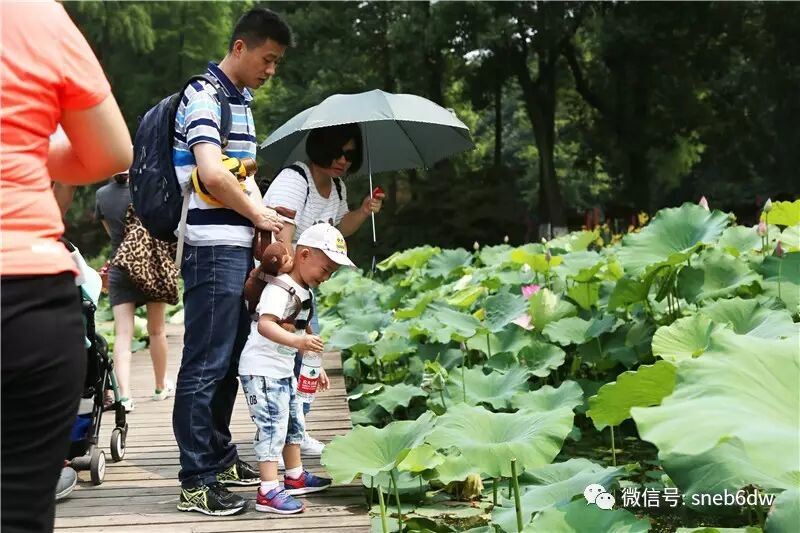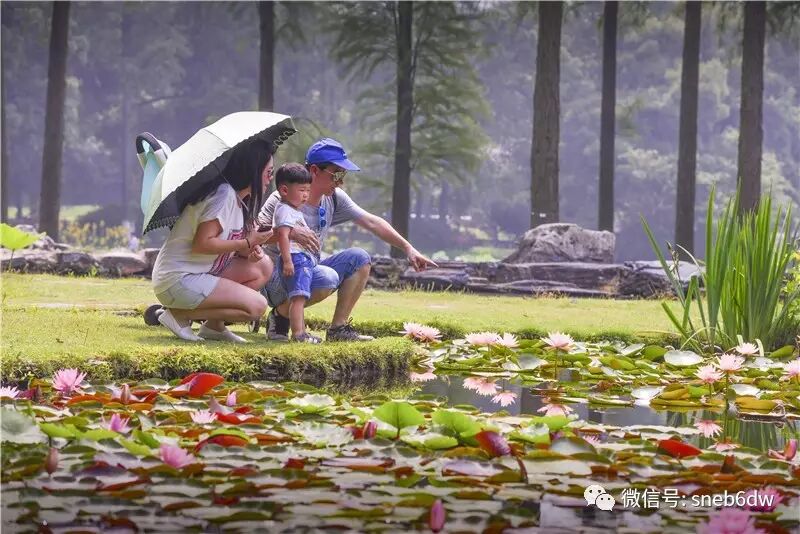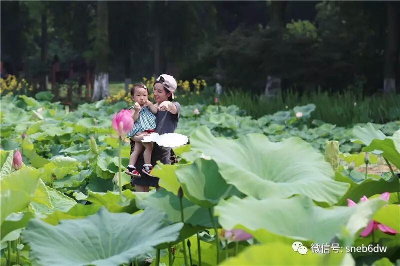 在荷塘边,职工黄崇昊的儿子黄逸宸小朋友发现荷叶是可以装水的,他目不转睛地看着圆滚滚的水球打着转转,兴奋不已,在一旁的妈妈也顿觉有趣,一起和孩子也玩了起来。