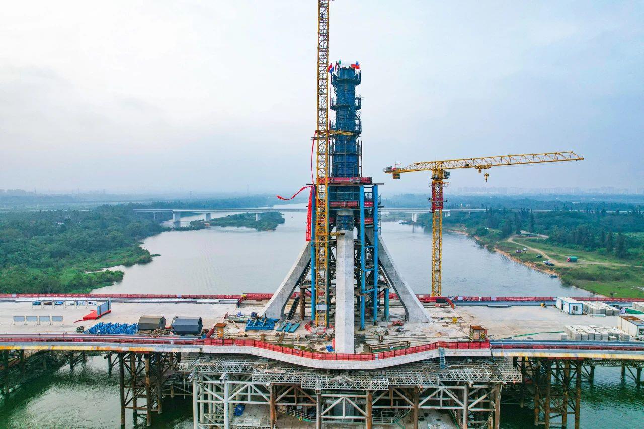 为确保主塔顺利封顶,施工过程中,项目团队针对主塔体量大、构造复杂、技术含量高、施工难度大等特点,积极优化施工方案,强化资源配置,采用钢筋结构部品化加工、钢塔节段集中工厂制造等措施,综合运用BIM辅助数字监控系统,解决了曲线塔肢模板定位、大倾角塔柱混凝土振捣、大体积混凝土防裂等问题,有效保证了工程质量和安全。主塔封顶后将同步进行缆索系统及附属工程施工。