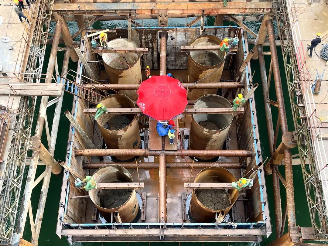 为此,项目部在施工前期咨询多方专家,同时结合现场地质水文条件以及施工成本,对钢板桩围堰、无底钢套箱、有底钢吊箱等多个方案进行比选,最终确定采用有底钢套箱方案。项目部还成立了技术攻关小组,通过召开专题会进行方案研讨、组织专家评审、邀请相关专家到现场指导、实行水下封底混凝土现场模拟验证等方式,确保方案顺利实施。4月6日,尺寸为12.2×14.9米、重84吨的钢套箱成功下水就位;4月7日,钢套箱与钢护筒之间的封底混凝土顺利完成浇筑;4月12日,钢套箱抽水验证混凝土封底成功。11号主墩钢套箱的成功封底为项目后续施工打下了坚实基础。(徐为华)