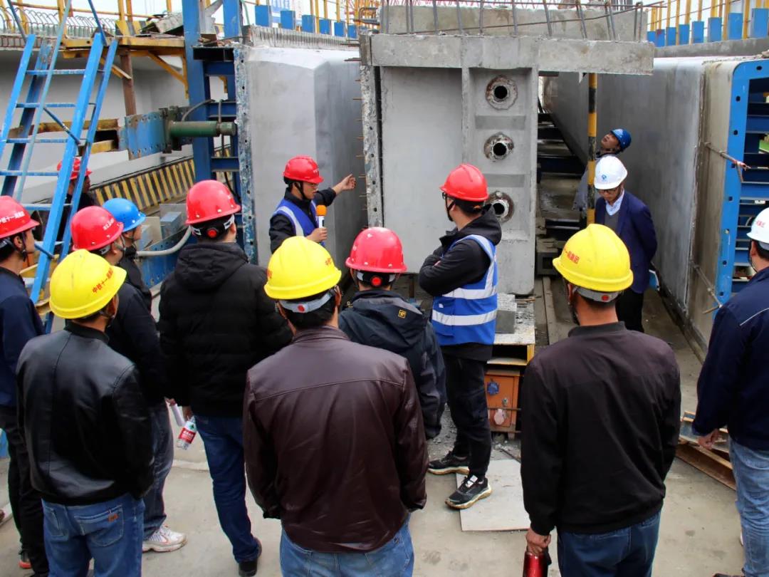在T梁预制场,观摩人员全面了解了项目2号梁场的基本情况,及预制T梁标准化施工的设施配置、工艺流程、质量标准和控制要点、各项保障措施、施工过程中存在的问题及相应的解决方案等内容;同时,认真观摩了整体式液压模板的使用方式及T梁预制效果。观摩人员对项目标准化施工、现场管控、质量管理、科技创新以及新设备新工艺的应用等给予了一致好评。