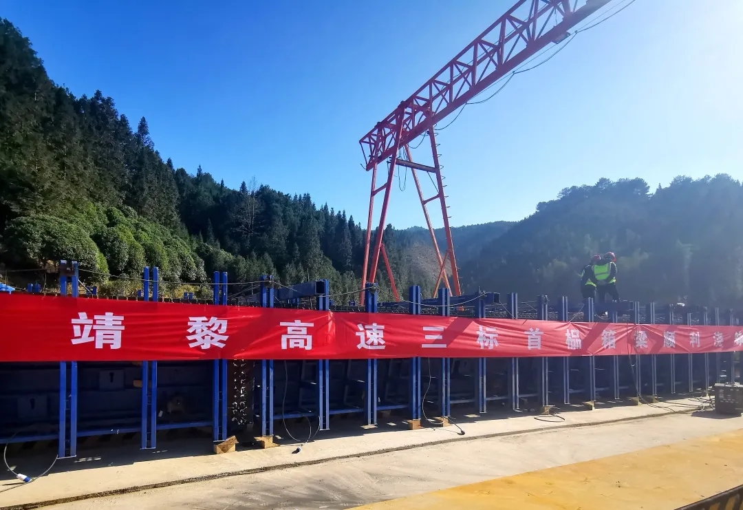 1月18日16时,经过近4个小时连续奋战,靖黎高速公路第三合同段首榀预制箱梁顺利完成浇筑,标志着项目桥梁施工进入新阶段。