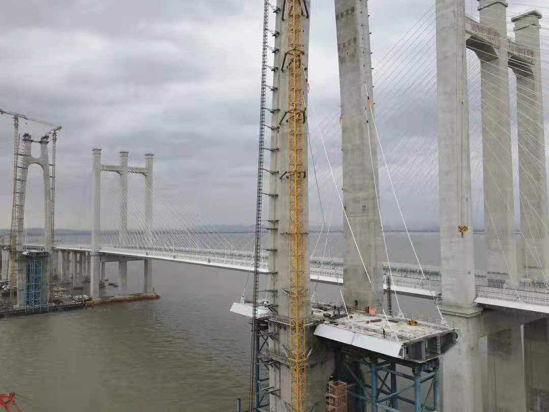 11月28日晚,在福厦铁路泉州湾跨海大桥施工现场,77号主墩4根1号索采用4台千斤顶设备进行同步张拉,同时76号主墩4对斜拉索顺利完成挂设,大桥全面进入斜拉索施工阶段。