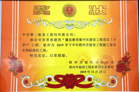 11月25日,分公司负责施工的广西藤县教育集中区项目小学获得2019年下半年梧州市建设工程施工安全文明标准化工地。
