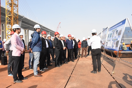 王同军一行在泉州湾跨海大桥76号主墩施工现场,听取了项目施工进展、质量安全、工艺工装等方面的介绍,细致了解了项目部3 ✕70米新颖特殊连续刚构设计;在项目智控调度中心,听取了项目整体施工情况、全线沙盘及特色亮点的汇报,详细询问了铁路工程管理平台的应用情况及效果。