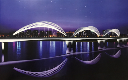 钛谷渭河大桥南起高新区钛谷路,北至龙钢路,全长1456米,为双向四车道,设计时速40公里。其中桥梁总长890米,南引道长378米,北引道长188米,与滨河南北路采用分离式立交连接。主桥造型为蝶形三连拱,有凤凰展翅之意,寓意宝鸡“凤翔九天”。