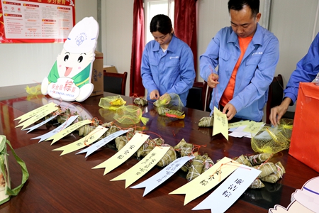为了让工友们能够尝到不同口味的粽子,项目工会主席组织员工把粽子分类挑选穿串,并给每一串粽子挂上了节日祝福标语,加热到适合口感的温度后迅速送至施工现场。让原本普通的粽子变得更加温情,也给枯燥的工地端午节增添了新的气氛。