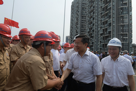 据项目常务副经理潘焕辉介绍,自2015年10月15日开工以来,项目部面对市区建设工期紧、任务重、要求高的严峻挑战,狠抓现场标准化建设,实施HSE管理模式,并先后攻克了超厚砂卵石层钢板桩围堰施工、超深破碎带地质条件下主墩桩基施工、洪水期间高水位承台施工、异型塔柱施工、超长塔柱竖向预应力施工、超重前支点挂篮安装等技术难题,于2017年1月21日和4月8日先后实现两岸主塔封顶,2017年12月13日和12月23日先后完成两主墩主梁边跨合龙,并于2018年1月17日实现中跨合龙。