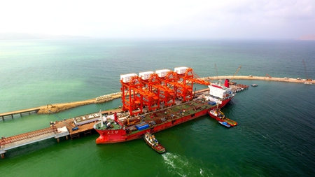 当地时间5月11日,4台煤炭专用卸船机稳稳地安装在胡布煤码头一号泊位,标志着由中交二航局承建的胡布煤码头一号泊位已经竣工并交付总包方。