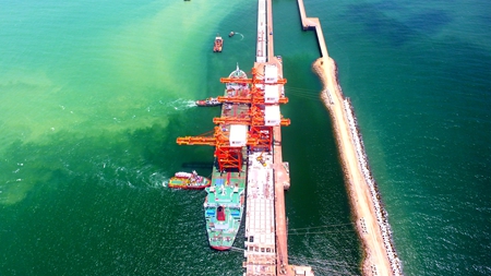 在工程建设中,项目部先后投入2套顶推平台和1套顶升平台用于码头工区施工,大大提高了施工效率,使一号泊位提前20天交付总包方使用,为电厂按时发电提供了有力保障。据悉,二号泊位的建设工作也已完成过半。