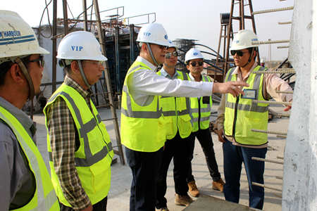 随后,董正良一行前往码头主工区,小到配电柜的工作情况,大到施工设备的运作情况,都是检查的范围。“阿拉伯外海风大浪高,海上施工更是不能有一点马虎。钢栈桥要定期检查,护栏要定期维护,HSE人员一定要配足……”董正良表示,“主工区关系到项目的整体进度,但是又面临着施工面窄、施工设备多、施工工期紧等多种不利因素,安全管理工作非常复杂,一定要有完整的规章制度,并逐条落实。”