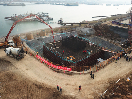 2月6日晚,随着最后一车混凝土入仓,伍家岗长江大桥首个主塔承台顺利浇筑完成。