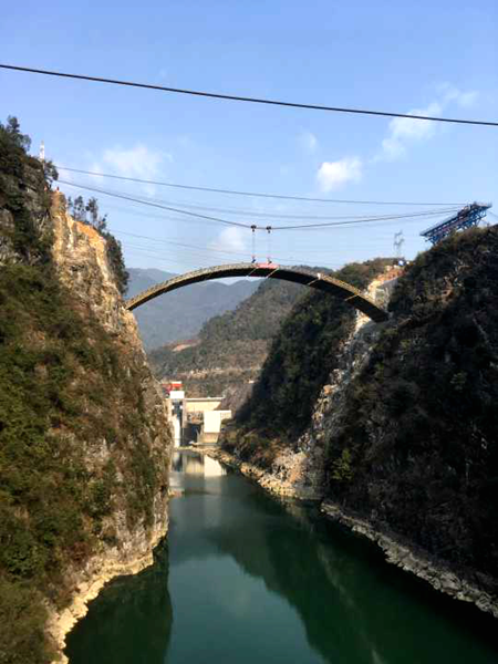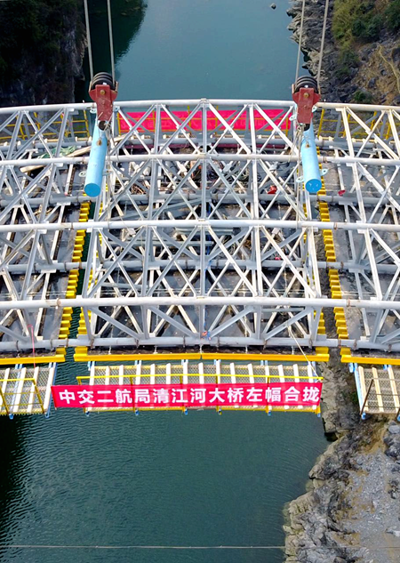 2月5日上午,随着最后一节劲性骨架拱肋吊装到位,建恩高速清江河大桥左幅劲性骨架拱肋顺利合龙。 清江河大桥为全长117.4米、主跨90米的上承式劲性骨架钢筋混凝土箱形拱桥,是湖北建恩高速公路控制性工程之一,采用无支架缆索吊悬拼工艺施工,先进行劲性骨架拱肋拼装合龙,然后进行外包混凝土拱箱施工。此次合龙的左幅劲性骨架拱肋,共分七节段对称吊装,每个节段重约25吨。 清江河大桥左幅劲性骨架拱肋的顺利合龙,为大桥2018年建成通车奠定了坚实基础,大桥右幅拱肋预计3月份实现合龙。