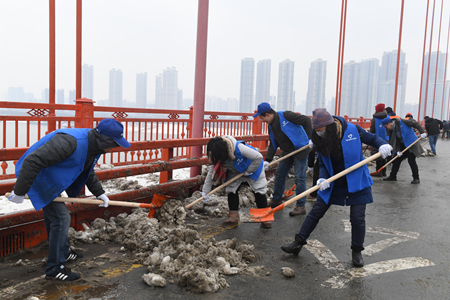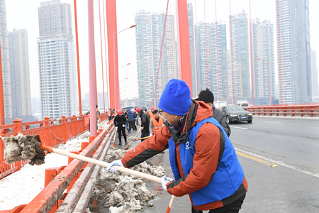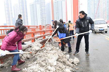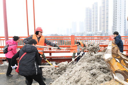 1月26日起,武汉地区受持续暴雪影响,市区被大雪覆盖,道路各处结冰,给城市交通及市民出行带来了极其不便。为积极响应市委、市政府号召,保证城市交通顺畅, 1月28日,分公司迅速组织机关本部、在汉及周边项目部、四大中心志愿者奔赴鹦鹉洲大桥开展除雪保畅行动。