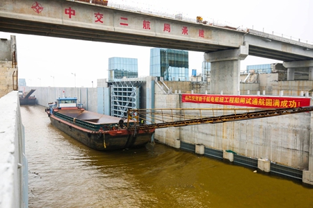 11月15日上午11点,在完成闸门的启闭检测后,两艘千吨级的沙船在两艘海事艇的领航下,缓缓从下引航道驶入闸室,停靠在闸室里,等待闸室充水使得水位达到通航要求后,慢慢向上游驶去,最终成功划过上闸首进入了上引航道,至此,新干航电枢纽船闸试通航顺利完成。