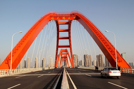 长沙市福元路湘江大桥项目是以二航局五分公司为主体,同湖南路桥和中交一公院组成联合体中标的设计施工总承包项目。该工程线路全长约3.5公里,其中跨越湘江段约1.4公里。大桥主桥采用连续三跨210米提篮式结合梁-钢拱组合结构,桥梁净宽31.5米,设计为双向六车道并设有双向人行道, 2012年11月20日通车,建成时为跨湘江中桥面最宽且兼具景观性的大桥。该桥在建设过程中,始终遵循“技术超前”的工作思路,不断优化施工工艺,在安装重约11600吨的主桥钢拱梁时,采用的“步履式平移顶推设备”安装技术,最大顶推距离达到730米,填补了长沙市在桥梁钢结构整体拼装和顶推技术上的空白,获得各方高度肯定与赞誉。