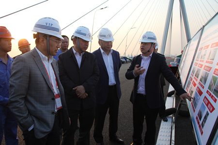 10月21日,交通运输部公路局副局长王太、工程管理处处长张竹彬,湖北省交通运输厅副厅长、党组成员姜友生在公司总经理由瑞凯的陪同下到沌口大桥项目检查指导工作。