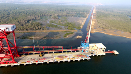 PIBT码头项目为高桩梁板式码头,码头长565米,宽20-35米,设计2个75000t级的散货泊位,主要从事煤、矿渣和水泥的贸易。该项目施工涉及水工结构、地基处理、堆场区地下管网及房建等多个专业,综合性强,其中5个用于装水泥的近50米高的钢筋混凝土筒仓,采用滑模工艺,为巴基斯坦首次采用该施工技术。
