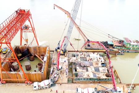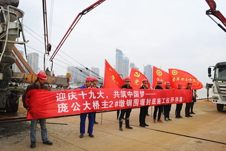 10月19日,在热烈庆祝党的十九大胜利召开之际,襄阳庞公大桥主2#墩左幅钢板桩围堰水下封底施工顺利完成。