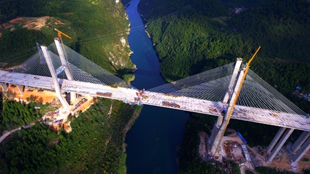 项目自2014年12月28日正式开工以来,先后攻克了溶洞环境下桩基施工、大体积承台混凝土浇筑温控、高塔远距离机制砂泵送等技术难题,于2016年5月25日和8月1日先后实现两主塔封顶。在主梁施工过程中,项目通过将工业自动化控制技术引入挂篮系统中,大大提高了主梁施工质效,于2017年9月5日和9月19日先后完成两主墩主梁的边跨现浇施工,并于9月30日实现大桥中跨合龙。