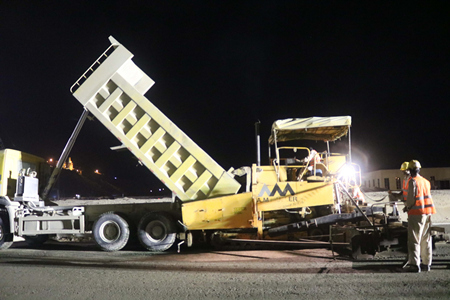 自6月19日首次水稳摊铺,经过近三个月的坚持,瓜达尔项目克服炎热的天气、匮乏的设备紧追工期。首层水稳采用平地机、装载机等常规设备配合的方式摊铺;第二层充分利用珍贵的摊铺机,加班加点,摊铺速度显著提升!