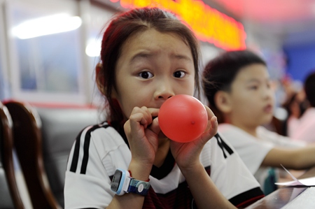 沌口大桥项目部的志愿者们用气球把大会议室装点成了一个小乐园,在这个乐园里,孩子们观看了大桥建设的视频动画,观看过程中,孩子们不停发出“哇”的惊叹,初步感受到了大桥的宏伟壮丽。