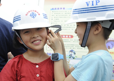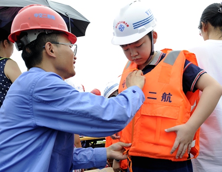 在桥面现场,孩子们还上了人生中第一堂工地安全课,项目安全主管高部长给孩子们演示了佩带安全帽、穿戴救生衣的正确方法,孩子们听得很认真,他们用稚嫩的小手尝试着戴安全帽,穿救生衣,可爱的脸蛋上挂满了汗珠。