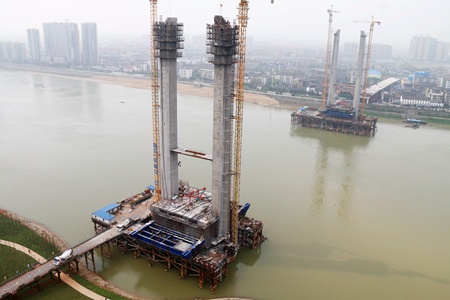 目前,益阳大桥9号和10号主塔施工已全面完成,主梁及斜拉索施工正在进行中。