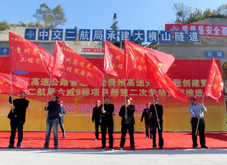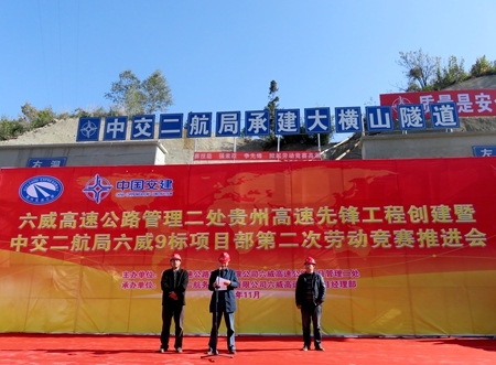 11月24日下午,大横山隧道彩旗招展、人声鼎沸,由六威9标项目部承办的“贵州高速先锋”工程创建暨“大干六十天”劳动竞赛推进会在此召开,六威高速公路项目办主任何东、六威高速公路管理二处处长卫斌、五分公司安全总监夏佑平等领导出席,推进会由六威高速公路管理二处党总支书记张云旭主持。