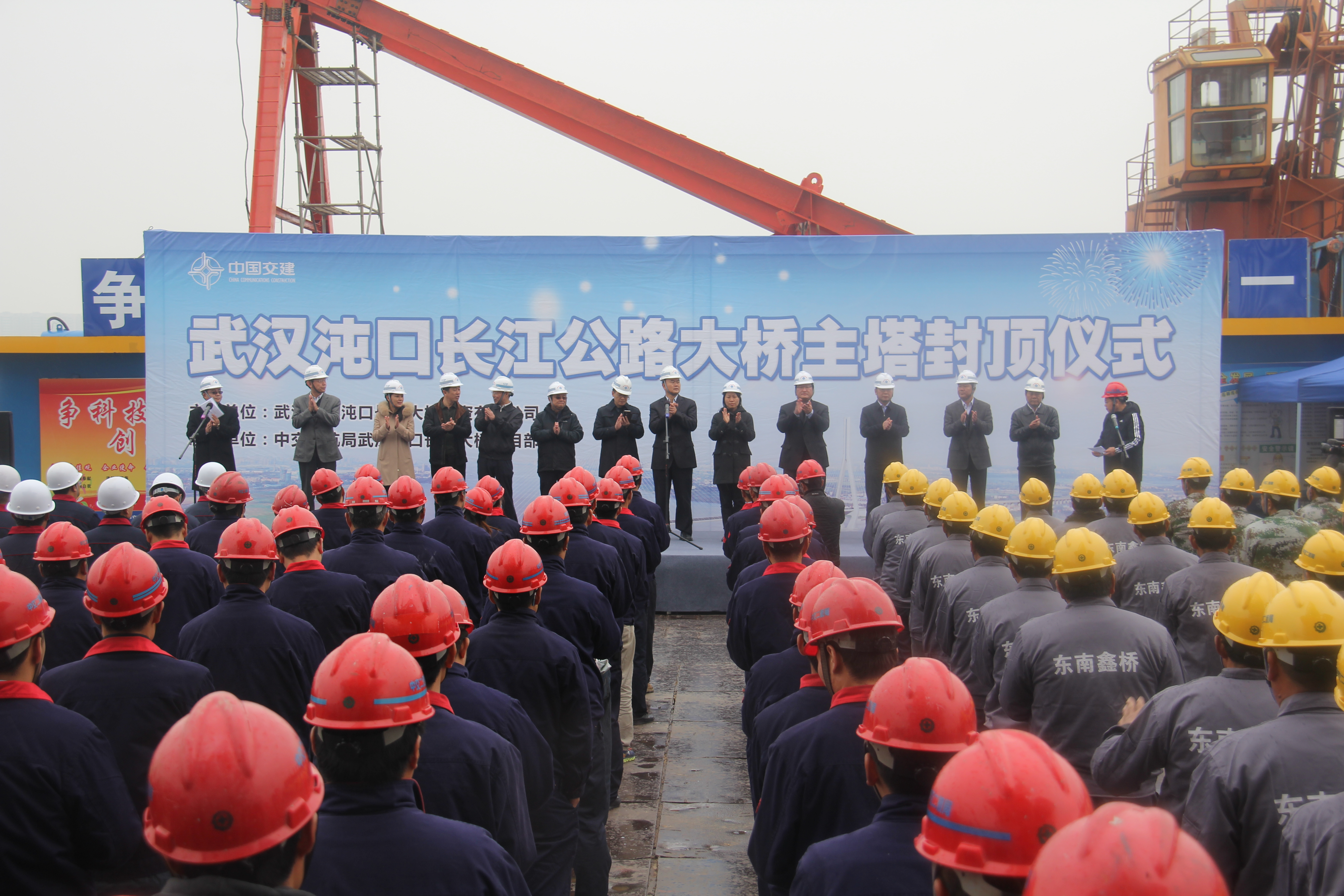 当天,省交通运输厅建设处副处长周炎新、武汉市交委总工程师贺敏、武汉市交委计划处处长蔡文波、华中区域总部总经理彭亮星、党委书记肖继生、中交二航局总经理由瑞凯、党委副书记、工会主席张文胜以及中交二公院总经理杨忠胜等出席封顶仪式。中交投资有限公司总经理赵晖宣布主塔封顶。仪式由项目公司总经理李芳武主持。项目经理汇报了项目建设情况。