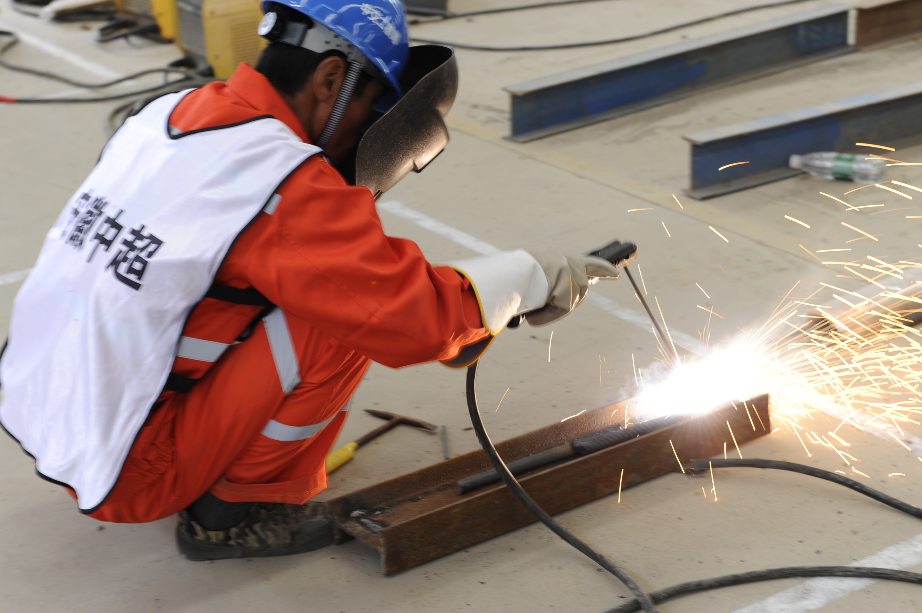下午2点半,起重和焊接比赛在两个赛场同时开始。伴着裁判员哨声响起,选手们立即全身心投入到比赛中。起重比赛赛场,选手们首先进行钢丝绳插接,两名选手配合进行,沉重、僵硬的钢丝绳在他们手脚间变得柔软起来,随着选手动作变化,吊索逐渐成型,参赛的四支队伍队友不时为自己队员摇旗呐喊、加油助威。焊接比赛赛场在钢筋加工厂房举行,选手们一丝不苟,聚精会神进行焊接,现场焊花四射。