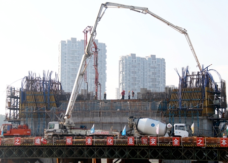 由分公司承建的益阳大桥为益阳市中心城区规划过江通道之一的城市桥,为双塔双索面预应力混凝土斜拉桥。本次浇筑的10号主墩下横梁,其平均跨度为21.8米,梁高6米,宽5米,采用上下两层分阶段施工,浇筑中每层混凝土设计方量为440方,采用C55混凝土进行浇筑。