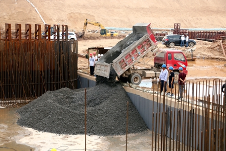 在经历了为期15天的基坑清淤工作后,7月6日,新干航电枢纽工程W3标泄水闸1#闸室开始浇筑第一仓混凝土,标志着该项目泄水闸施工局面正式打开。