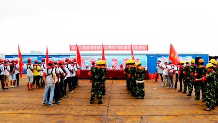 “报告指挥长,根据海南省气象台发布的台风预警信号为蓝色,时间相当紧迫,请指示。”信息保障队队长紧急汇报当前气象情况。“立即启动防台一级战战备,全队人员投入战斗。”项目经理有条不紊的部署防台工作。5月12日上午10点,一场由海南铺前大桥项目部组织的主墩防台应急演练正如火如荼进行中。
