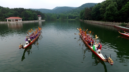 为了完成最后的任务“划龙舟”,大家休息过后整装待发,再次启程。到达比赛地点后,教练先带领两队队员学习了划龙舟的基本要领,经过简单的练习后,“猛虎队”和“剪刀队”正式进入比赛。“预备,开始”“一、二、一、二……”两队选手喊着整齐的口号,你追我赶,不分上下,经过3轮比拼,“剪刀队”取得胜利。最后,40名青年职工一起喊出“we are family!!!”的口号,并以人体拼字的形式拼出沌口大桥的拼音首字母“ZKDQ”,从而圆满结束此次活动。