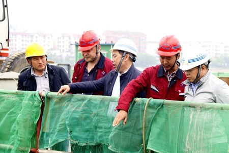 上午10点,杨志德一行到达益阳大桥南岸施工现场后,他亲自对门机限位装置进行了实地检查,并对现场设备安全使用情况进行了详细询问。在听取了现场负责人的工作汇报后,杨志德对益阳大桥的整体进展与现场安全、文明施工情况表示肯定。随后,杨志德在了解现有双壁钢围堰工况时,提出了自己的见解与想法,并围绕更方便、简洁、安全的提高围堰施工效率和施工工艺,同现场施工人员进行了热烈讨论,为大桥建设的推进提供了宝贵建议。