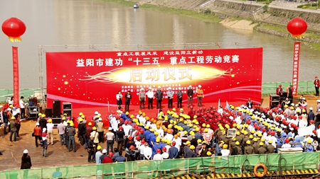 “下面我宣布:益阳市建功‘十三五’重点工程劳动竞赛正式启动!”益阳市总工会主席胡立安话音刚落,益阳大桥北岸现场重点工程方阵职工代表跃跃欲试,中交二航局益阳大桥项目建设突击队旗在风中猎猎飘扬。