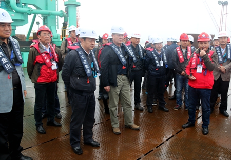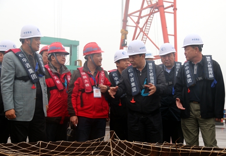 毛超峰听取了项目常务经理的工作汇报,实地考察了工程目前建设进展情况,详细询问了34#主墩钻机施工工作原理及施工流程,观看了主墩钢护筒施工图纸,并肯定了主墩“文”字设计概念。他对工程进展中存在的困难十分关心,尤其是对目前影响工程进度的大临和拌合站的征地拆迁工作和主墩施工供电系统顺畅情况十分重视。他要求文昌市政府和铺前镇政府积极配合中交二航局的大桥建设,加紧完成剩余征地拆迁工作,确保铺前大桥项目按期完成既定工作任务。