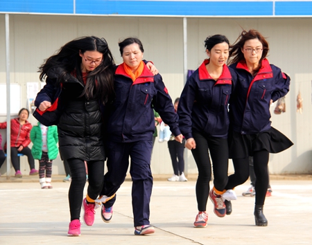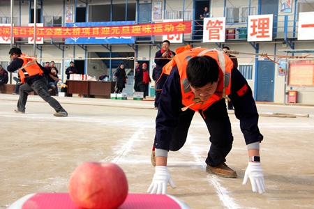 个人赛环节,三人拔河(三人分别朝三个方向夺取目标)引发了一场苹果争夺战,有人力大如牛,瞬间突围,引发喝彩,也有人不分上下,最后选择帮助团队的兄弟赢得比赛。水果蹲则吸引了项目女职工的关注,职工小家属按捺不住激动的心情,参与其中,欢乐无比。