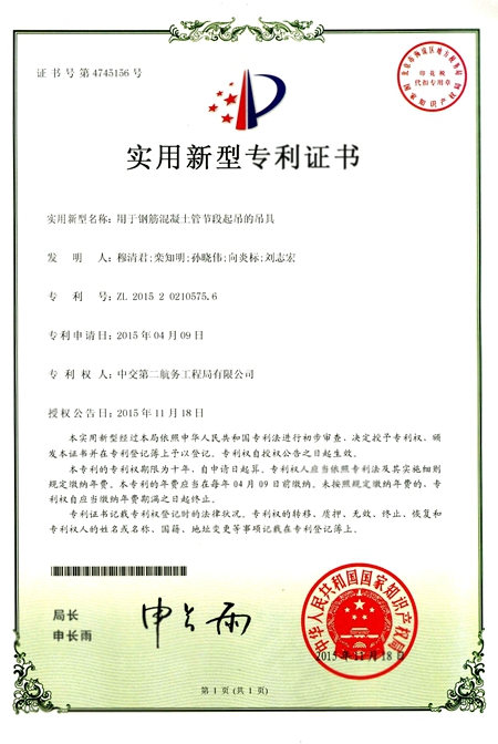 日前,孝感项目申报的《用于钢筯混凝土管节段起吊的吊具》发明获中华人民共和国国家知识产权局实用新型专利证书。