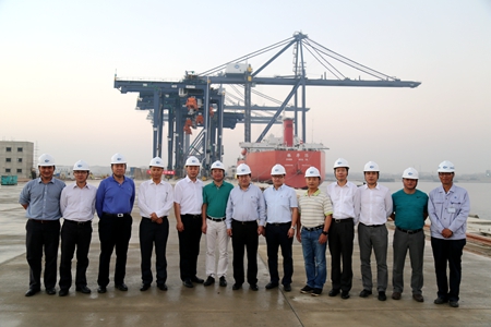 孙子宇一行实地查看了巴基斯坦深水港项目的堆场路面铺设施工以及码头钢轨拼装架设情况,听取了项目施工进度、工艺创新、安全质量、属地化管理和项目文化等方面的情况汇报,并走上码头现场观摩振华运输船的港机卸载工作。