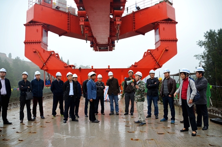 会后,学员们深入箱梁运架现场,进行了为期两天的实地观摩。局内首次使用的运架一体式架桥机、国内首台900吨单主梁架桥机、成贵铁路项目高达81.5%的桥隧比……众多亮点成为中交二航局铁路箱梁运架设备技术培训的“暴风眼”,一轮又一轮头脑风暴聚焦于成贵铁路箱梁运架设备的使用与改造。