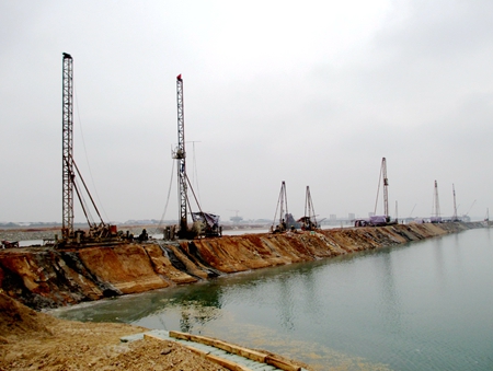 据了解,该节点工程的船闸上游全年围堰长294米,下游全年围堰长366米;泄水闸上游围堰长205米,下游围堰长217米,纵向围堰长412米,施工内容主要包括围堰砂砾料堰体填筑、粘土心墙填筑、围堰进占及抛石护脚、围堰高喷防渗。其中,高喷防渗施工采用了二重管法高压旋喷技术,共投入高压旋喷机和钻孔机各14台。