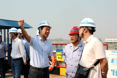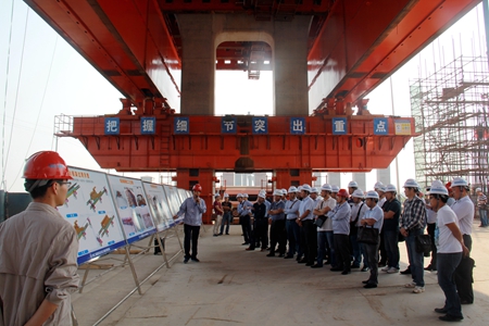 上午9点40分,张文胜一行参观了项目北岸引桥移动模架、北岸主墩、南接线T梁预制场以及南岸搅拌站和试验室。各位同行纷纷拿起手机拍摄照片,并感叹沌口大桥标准化施工落实到位。